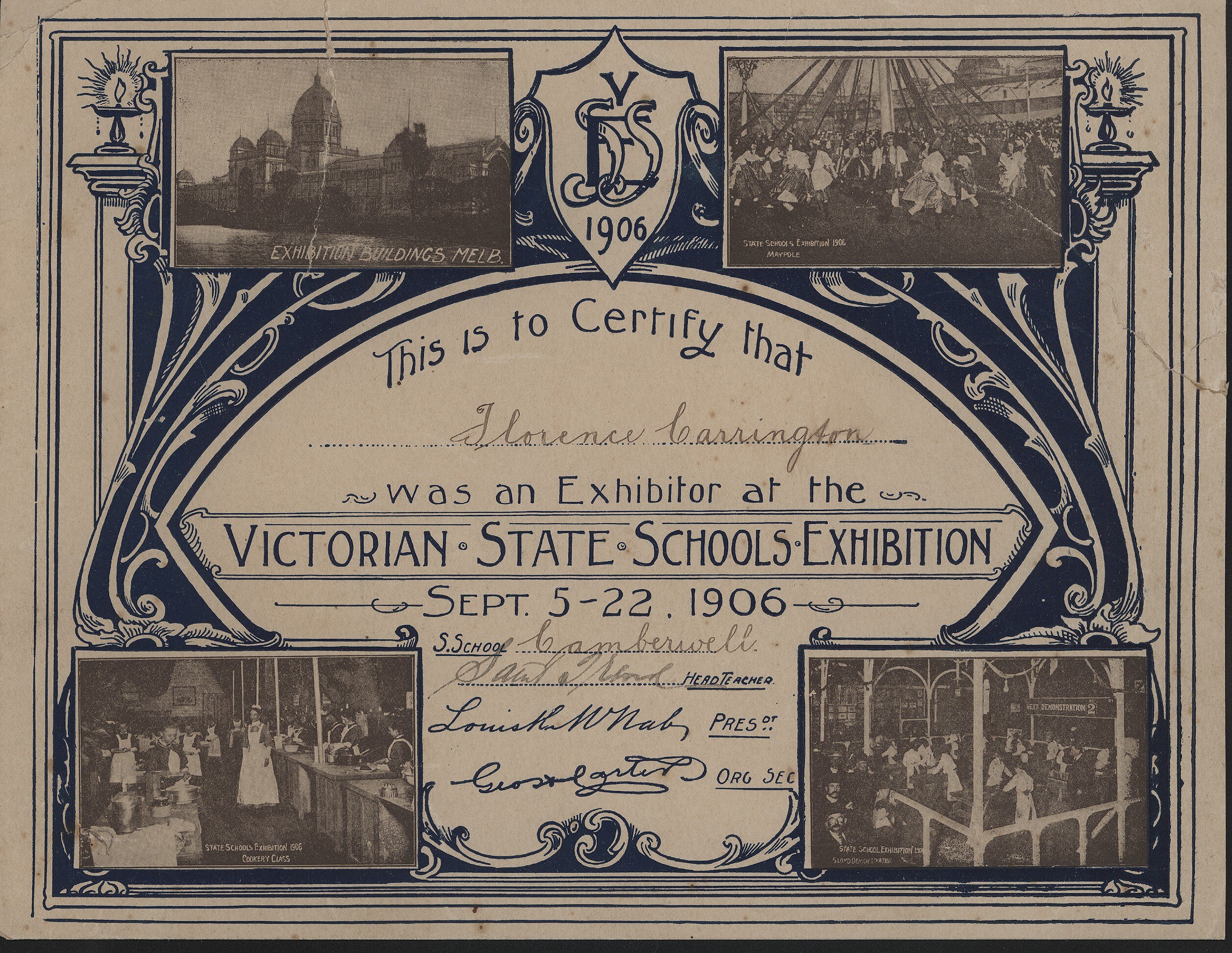 printed on obverse: This is to Certify that/ [handwritten] Florence Carrington/ was an Exhibitor at the/ VICTORIAN STATE SCHOOL EXHIBITION/ SEPT. 5-22. 1906/ S.SCHOOL [handwritten] Camberwell/ [handwritten][Illeg] HEADTEACHER/ signature [illeg] PRESor/ Signature [Illeg] ORG SEC photo[top,left] EXHIBITION BUILDINGS; photo [top,right] STATE SCHOOLS EXHIBITION 1906/ MAYPOLE; photo [bottom, left] STATE SCHOOLS EXHIBITION 1906/ COOKERY CLASS; photo[bottom, right] STATE SCHOOL EXHIBITION 1906/ SLOYD DEMONSTRATION
