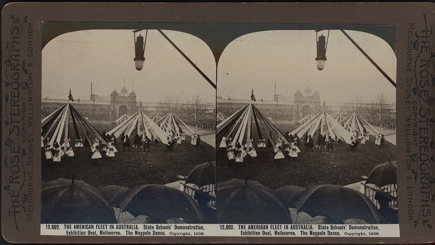 George Rose souvenir stereograph showing children performing a maypole dance at the State School Demonstration, held at the Exhibition Oval on 1 Sep 1908 as part of celebrations held to mark the American Fleets visit to Victoria from 29 August - 5 September 1908.