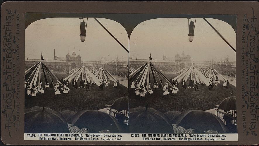 Printed at both ends of cardboard (obverse) :THE ROSE STEREOGRAPHS/ COPYRIGHT/ MELBOURNE, SYDNEY, WELLINGTON & LONDON Printed on photograph: 12,892. THE AMERICAN FLEET IN AUSTRALIA. State Schools' Demonstration,/ Exhibition Oval, Melbourne. The Maypole Dance. COPYRIGHT, 1908.