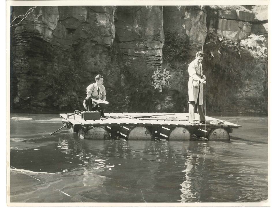 Two men on top of a pontoon floating on water. One man is crouched to the left, holding a pen and paper while the other man is measuring the depth of the water with a piece of rope.