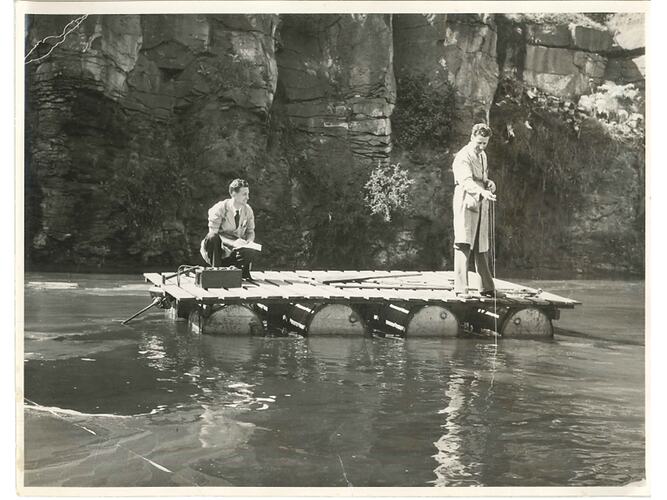 Black and white photograph of Plant Engineer Rex Livett (right) and Superintendent Don Deveson (left) on a pontoon in the Sunshine Harvester Works' quarry. Livett and Deveson are checking the depth of the water in the quarry. The quarry was located at the rear of the factory's woodmill.