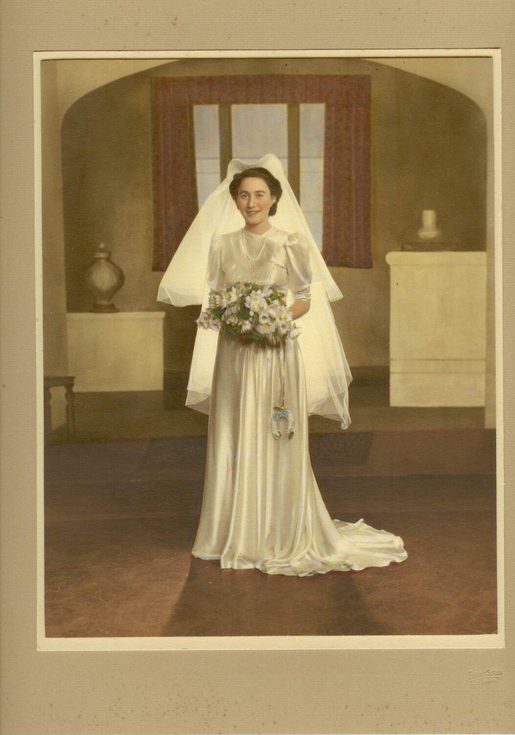 Norma wore a wedding dress with a long white veil, pearls and a fabric-covered horseshoe. After her wedding she carefully put aside her outfit and preserved her dress and horseshoe all her long life.
