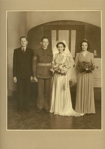 Bridal party portrait taken on the wedding day of Arthur William '(Bill') Green and Norma Burns. They were married at the Methodist Church in Fitzroy Street, St Kilda. He was serving in 3 Corps of Signals in World War II (service # # VX109455), and had received advice that he was about to be transferred to a combat zone in New Guinea.