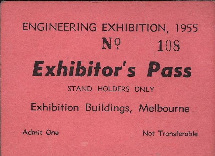 Printed on the obverse: ENGINEERING EXHIBITION,1955/ No 108/ Exhibitor's Pass/ STAND HOLDERS ONLY/ Exhibition Buildings,Melbourne/ Admit One Not Transferable
