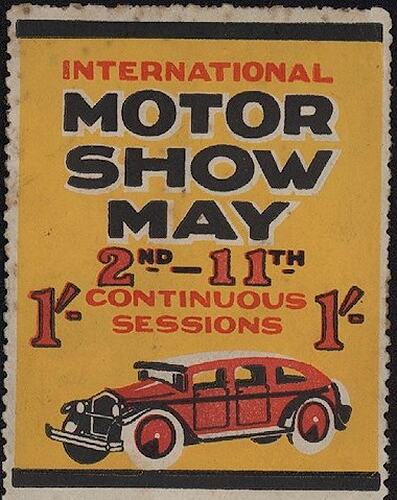 Printed on obverse: INTERNATIONAL/ MOTOR/ SHOW/ MAY/ 2ND - 11TH/ 1'- CONTINUOUS/ SESSIONS 1'