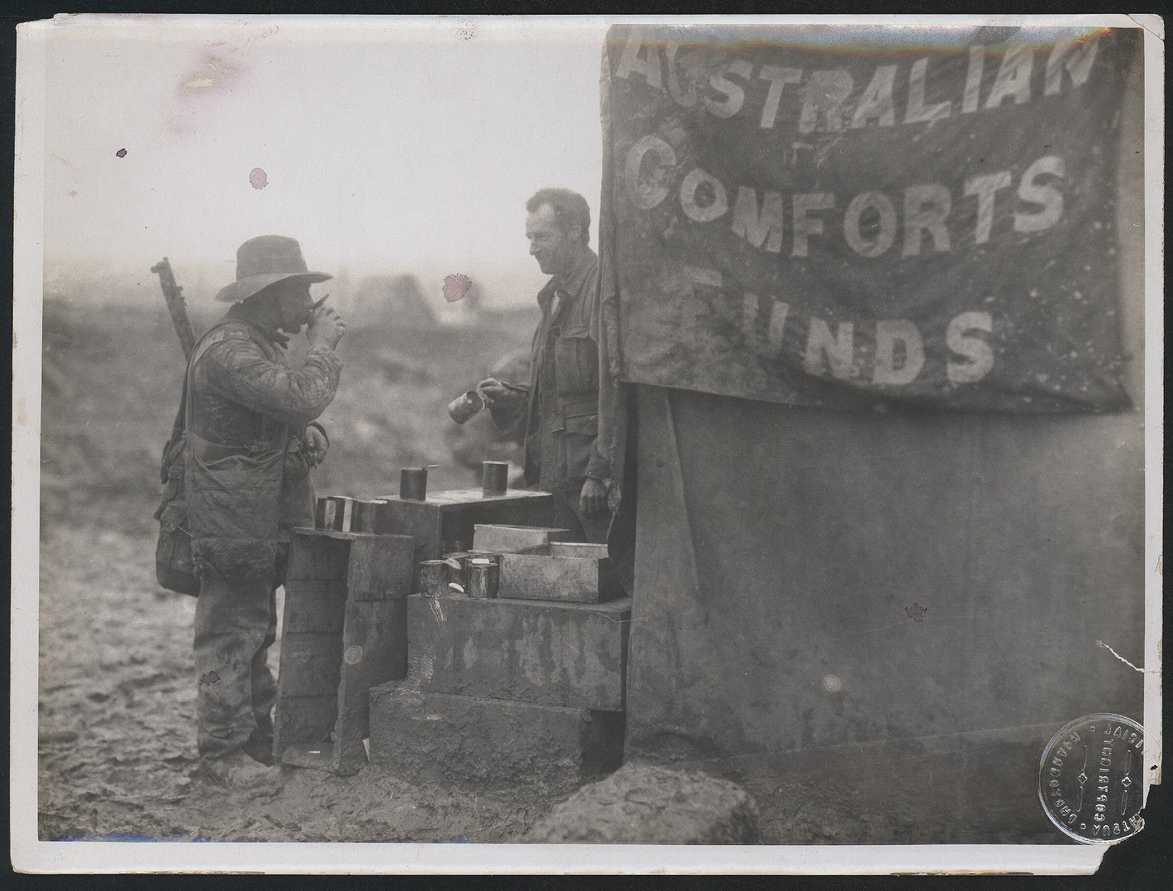 Embossed on the back of the photograph; 'AUSTRALIAN OFFICIAL / PHOTOGRAPH / COPYRIGHT' Hand written in grey pencil on the back of the photograph; 'E34 / Pea Soup or Cocoa' Typed on a piece of paper that is adhered to the back of the photograph [half of it missing]; '....ralian Comforts Buffet.'
