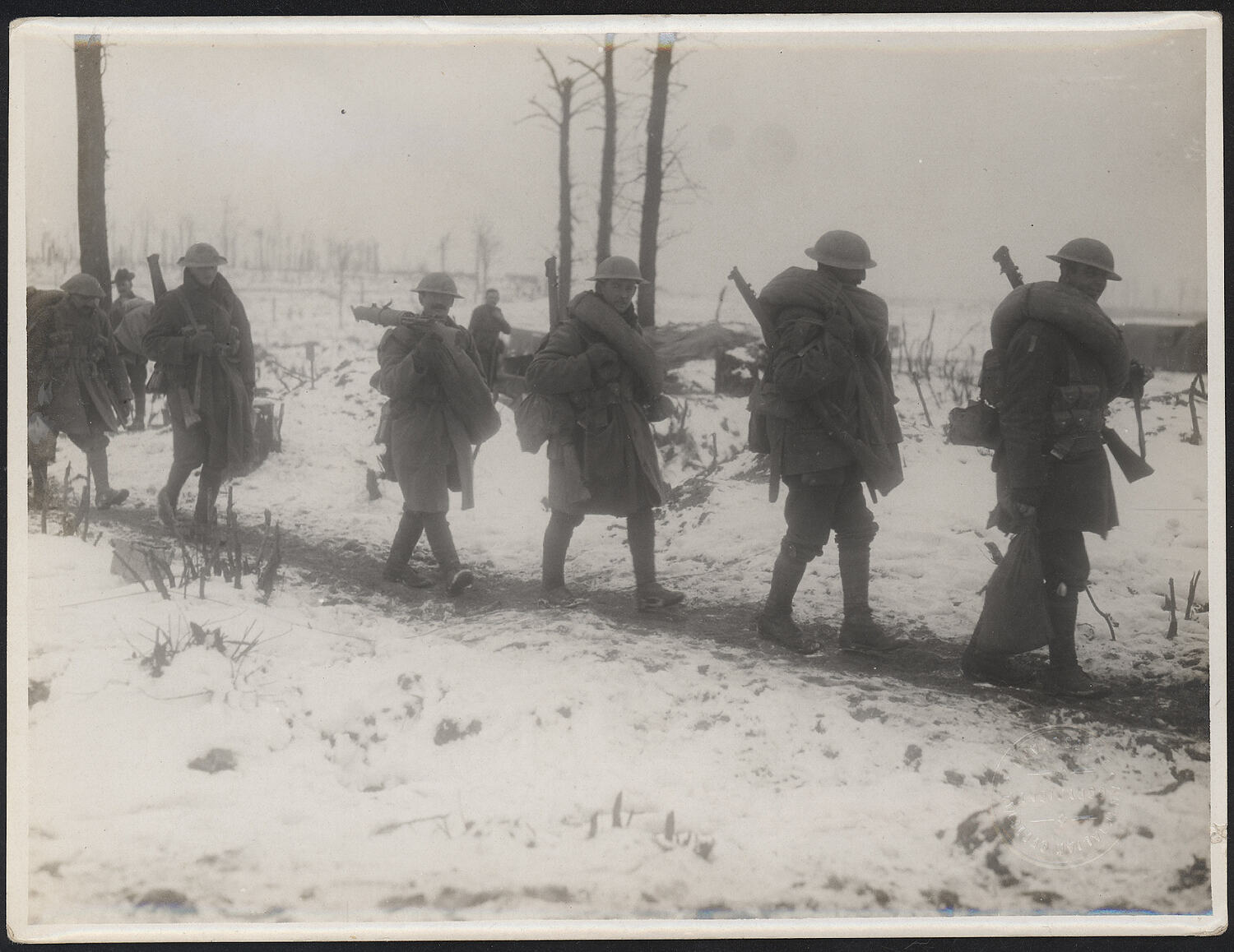 Six Lewis gunners walking along a snow covered track at Longueval France. They are making their way to the front line.