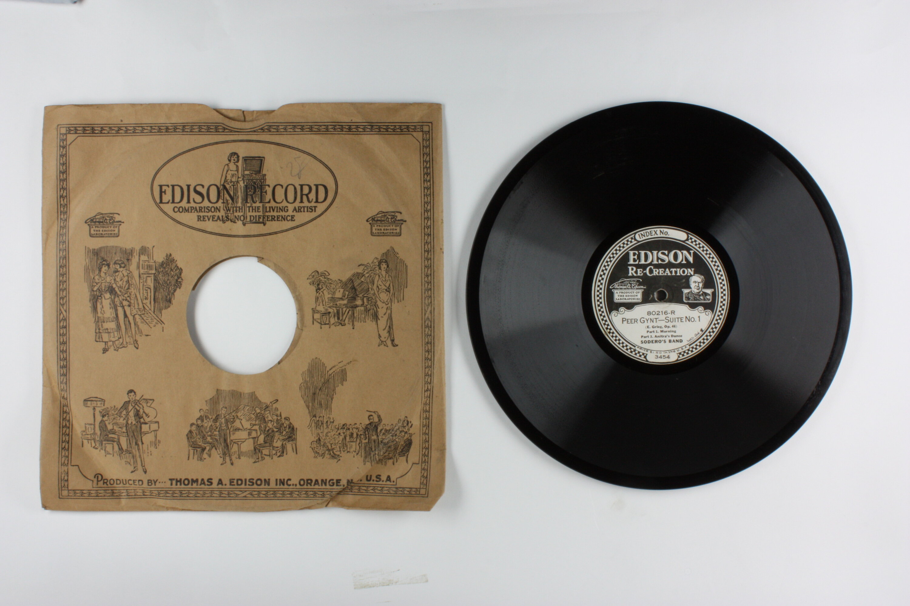Edison double-sided diamond disc recording (10in). Side A: Peer Gynt - Suite no.1, Part 1. Morning and Part 3. Anitra's Dance, Sodero's Band. Side B: Peer Gynt - Suite No. 1, Part 2. Ase's Death and Part 4. In The Hall Of The Mountain King, Sodero's Band. Produced by Edison, United States. Technology: Edison Diamond Disc. Classification: Classic Orchestra. Year recorded: unknown. Year pressed: unknown.