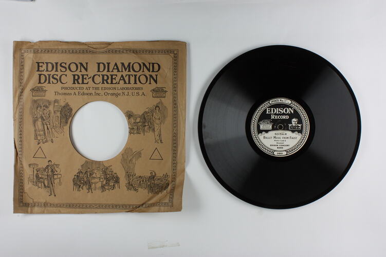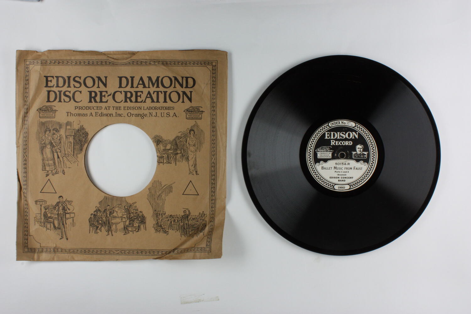 Edison double-sided diamond dsic recording (10in). Side A: Ballet Music From Faust, Edison Concert Band. Side B: Benediction Of The Poignards, Edison Concert Band. Produced by Edison, United States. Technology: Edison Diamond Disc. Classification: Classic Orchestra. Year recorded: unknown. Year pressed: unknown.