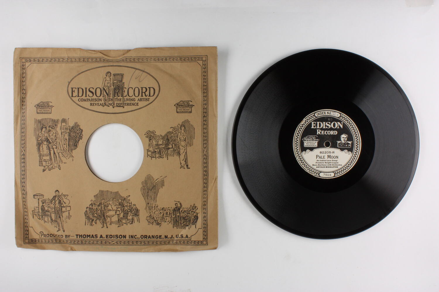 Edison double-sided diamond disc recording (10in). Side A: Pale Moon, Bass-Baritone with Orchestra Arthur Middleton. Side B: Kashmiri Song, saprano with orchestra Maggie Teyte. Produced by Edison, United States. Technology: Edison Diamond Disc. Classification: Classic Orchestra. Year recorded: unknown. Year pressed: 1920-1929
