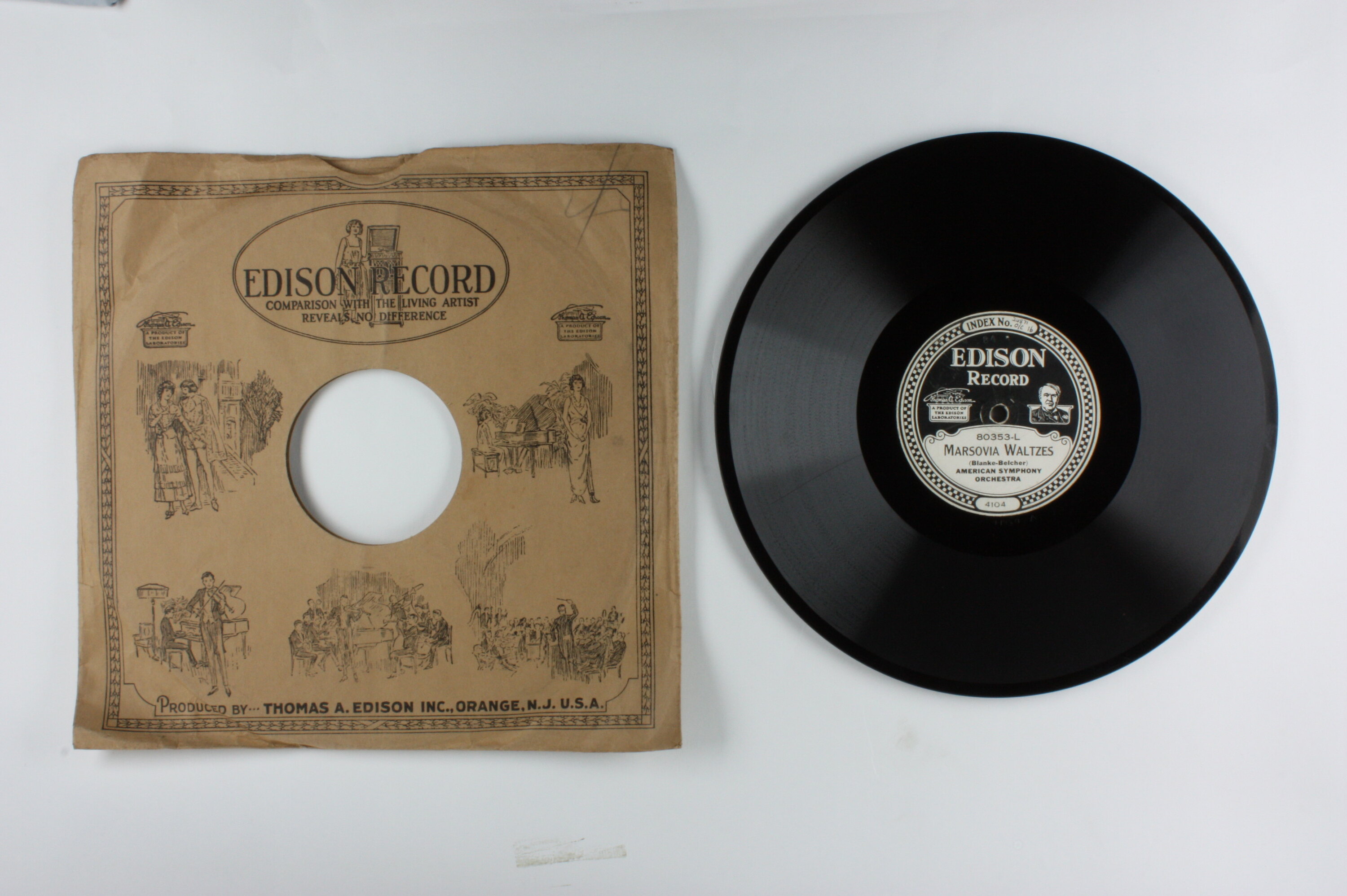 Side A: INDEX NO. 24871 O/C 16 / EDISON RECORD / A PRODUCT OF EDISON LABORATORIES / 80353-L / MARSOVIA WALTZES / (Blanke-Belcher) / AMERICAN SYMPHONY / ORCHESTRA / 4104 Side B: EDISON RECORD / A PRODUCT OF EDISON LABORATORIES / 80353-R / FAUST WALTZ / (Ch. Gounod) / PEERLESS ORCHESTRA / 5352 One side of sleeve: EDISON RECORD / (text and illustrations). Second side of sleeve: (text) / (Patents - list of years latest1918) / (text)