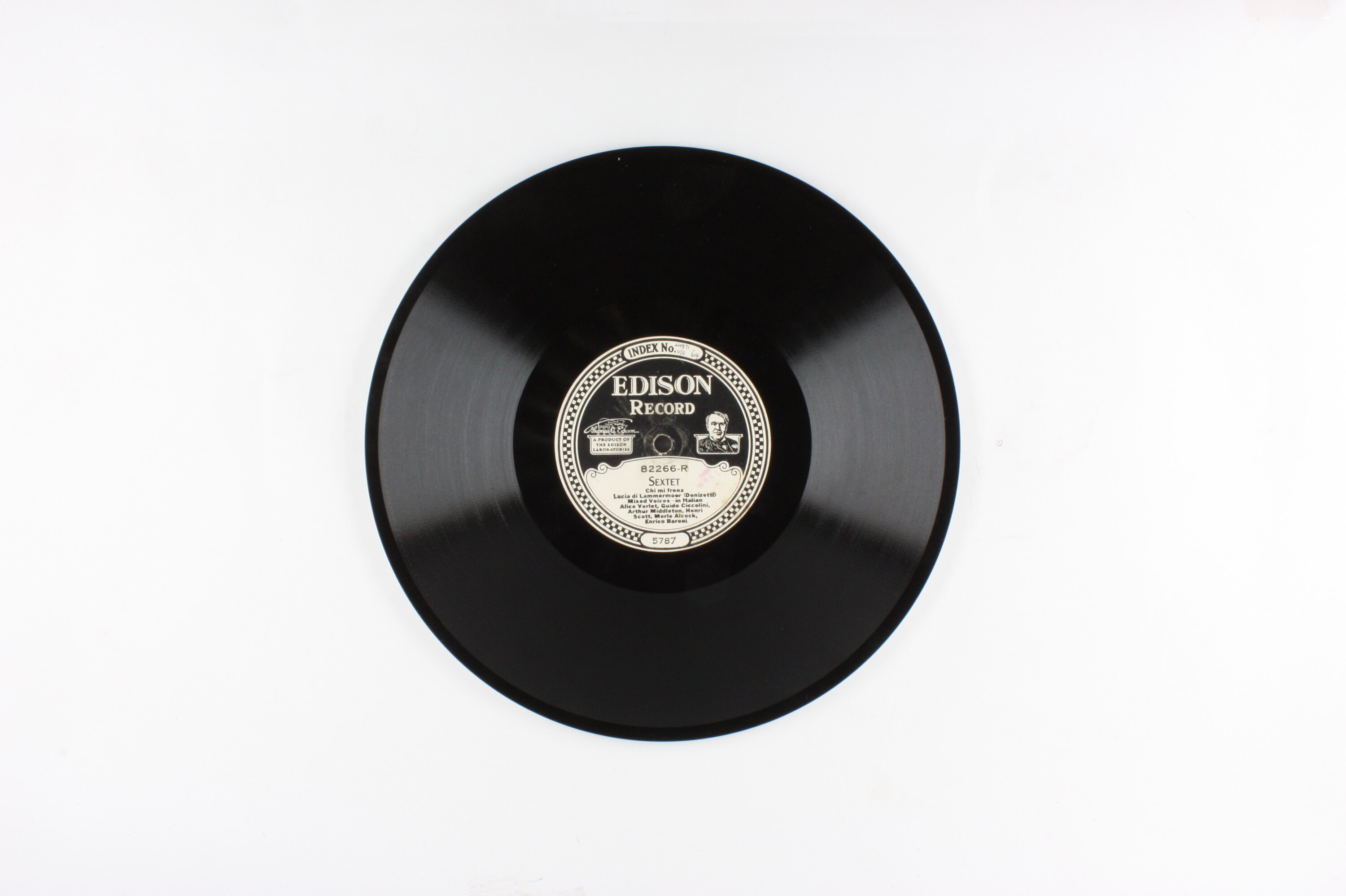 Side A: INDEX NO. 24871 V/O 64 / EDISON RECORD / A PRODUCT OF THE EDISON LABORATORIES / 82266-R / SEXTET / Chi mi frena / Lucia di Lammermoor (Donizetti) / Mixed Voices - In Italian / Alice Verlet, Guido Ciccolini, / Arthur Middleton, Henri / Scott, Merie Alcock, / Enrico Baroni / 5787 Side B: EDISON RECORD / A PRODUCT OF THE EDISON LABORATORIES / 82266-L / SEXTET / Chi mi frena / Lucia di Lammermoor (Donizetti) / Mixed Voices - In Italian /Marie Rappold, Margaret Matzenauer, / Giovanni Zenatello, Arthur / Middleton, Thomas / Chalmers, Enrico / Baroni / 5224