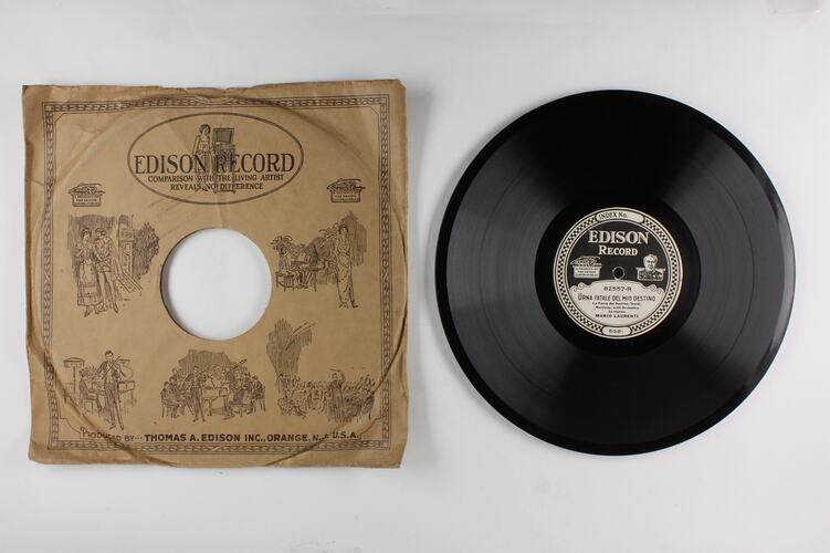 Side A: INDEX NO. 24871 V/O 59 / EDISON RECORD / A PRODUCT OF THE EDISON LABORATORIES / 82557-L / SUONI LA TROMBA E INTREPIDO / I Puritani (Bellini) / Baritone and Bass-Baritone, with Orchestra / In Italian / TAURINO PARVIS and / ARTHUR MIDDLETON / 6253 Side B: EDISON RECORD / A PRODUCT OF THE EDISON LABORATORIES / 82557-R / URNA FATALE DEL MIO DESTINO / La Forza del Destino (Verdi) / Baritone, with Orchestra / In Italian / MARIO LAURENTI / 6381 One side of sleeve: EDISON RECORD / (text and illustrations) Second side of sleeve: (text) / (Patents - list of years latest1918) / (text)