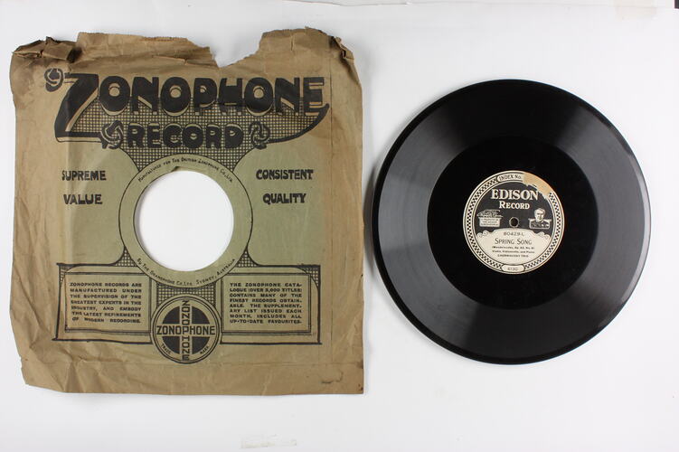 Side A: EDISON RECORD / A PRODUCT OF THE EDISON LABORATORIES / 80429-L / SPRING SONG / (Mendelssohn, Op. 62, No. 6) / Violin, Violincello and Piano / CHERNIAVSKY TRIO / 6130 Side B: EDISON RECORD / A PRODUCT OF THE EDISON LABORATORIES / 80429-R / (a) ANITRA' DANCE / (Grieg) / (b) AT THE BROOK / (Rene de Boisdeffre, Op. 52) / Violin, Violincello and Piano / CHERNIAVSKY TRIO / 6128 One side of sleeve: ZONOPHONE RECORDS / (text and illustrations) Second side of sleeve: (text and illustrations)