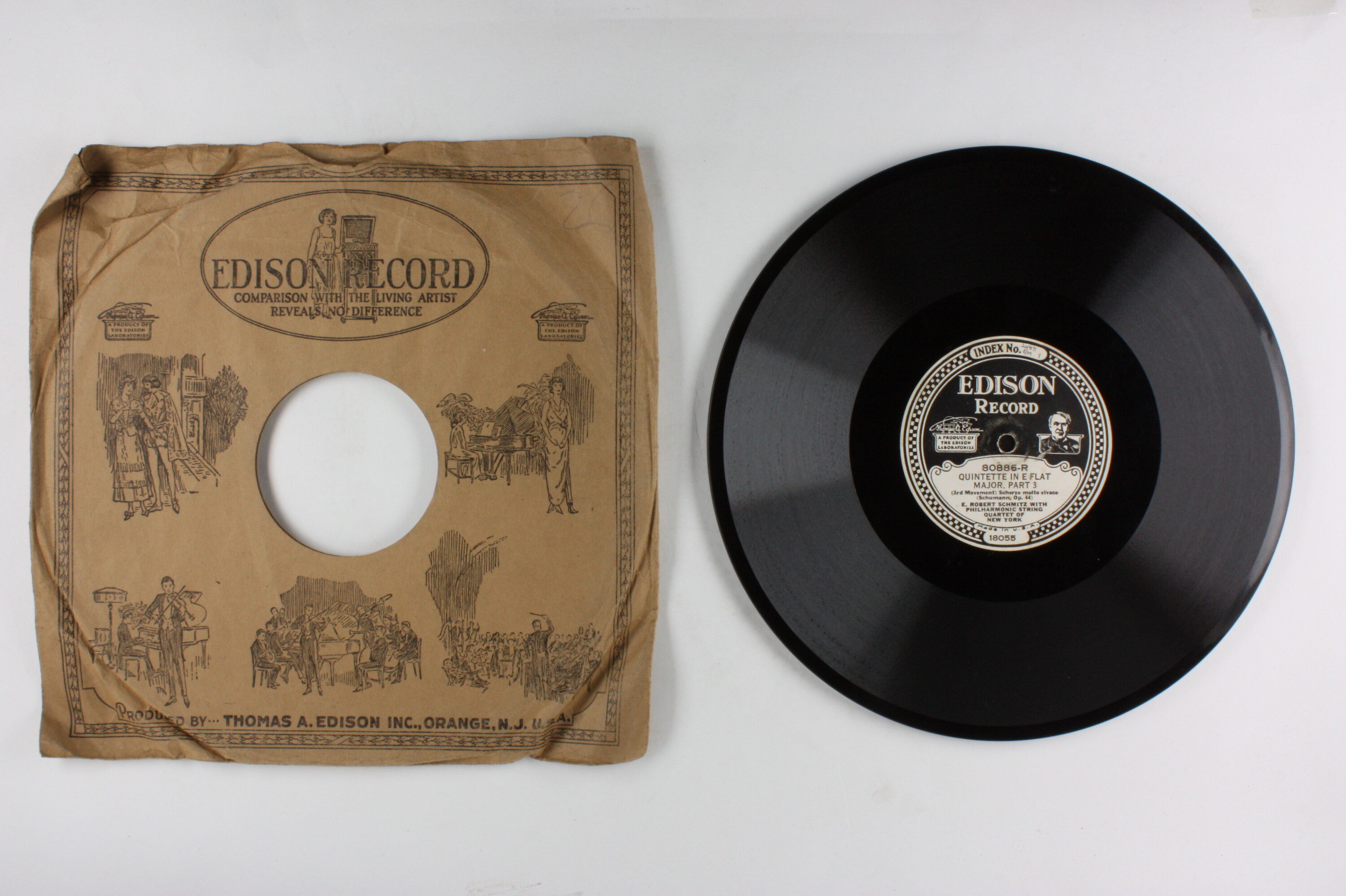 Side A: INDEX NO. 24871 1 C/M / EDISON RECORD / A PRODUCT OF THE EDISON LABORATORIES / 80886-R / QUINTETTE IN E FLAT / MAJOR, PART 3 / (3rd Movement) Scherzo molto vivace / (Schumann, Op. 44) / E. ROBERT SCHMITZ WITH / PHILHARMONIC STRING / QUARTET OF / NEW YORK / Made in U.S.A. / 18055 Side B: EDISON RECORD / A PRODUCT OF THE EDISON LABORATORIES / 80886-L / QUINTETTE IN E FLAT / MAJOR, PART 4 / (Finale) Allegro ma non troppo / (Schumann, Op. 44) / E. ROBERT SCHMITZ WITH / PHILHARMONIC STRING / QUARTET OF / NEW YORK / Made in U.S.A. / 18056 One side of sleeve: EDISON RECORD / (text and illustrations) Second side of sleeve: (text) / (Patents - list of years latest1918) / (text)
