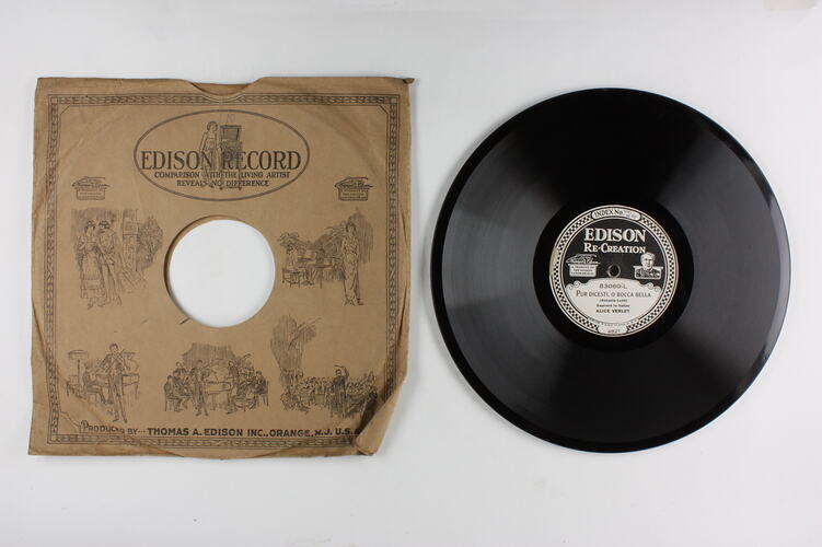 Side A: INDEX NO. 24871 V/O 45 / EDISON RE-CREATION / A PRODUCT OF THE EDISON LABORATORIES / 83060-L / PUR DICESTI, O BOCCA BELLA / Easter Hymn / (Antonio Lotti) / Soprano in Italian / ALICE VERLET / PRICE $2.00 in the U.S.A. / 4821 Side B: EDISON RE-CREATION / A PRODUCT OF THE EDISON LABORATORIES / 83060-R / CHANSON DE FLORIAN / (Florian's Song) / (Godard) / Soprano in French / ALICE VERLET / PRICE $2.00 in the U.S.A. / 4889 One side of sleeve: EDISON RECORD / (text and illustrations) Second side of sleeve: (text) / (Patents - list of years latest1918) / (text)