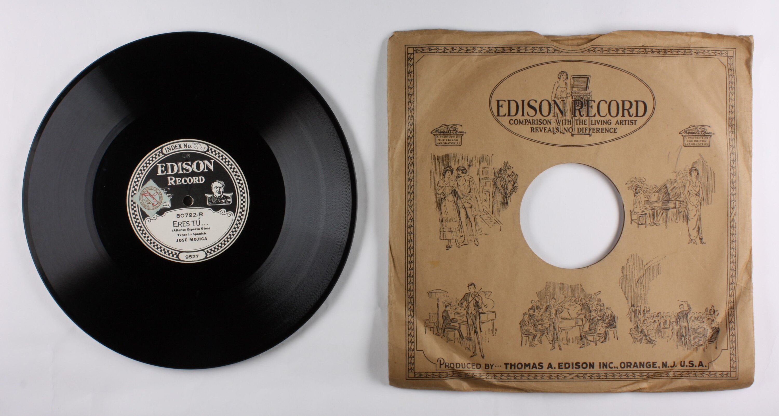 Side A: INDEX No. 24871 V/O 57 / 26 / EDISON RECORD / A PRODUCT OF THE EDISON LABORATORIES / 80792-R / ERES TÚ... / (Alfonso Esparza Oteo) / Tenor in Spanish / JOSÉ MOJICA / 9527 Side B: EDISON RECORD / A PRODUCT OF THE EDISON LABORATORIES / 80792-L / GOLONDRINA MENSAJERA / (Arr.by Alfonso Esparza Oteo) / Tenor in Spanish / JOSÉ MOJICA / 9528 One side of sleeve: EDISON RECORD / (text and illustrations). Second side of sleeve: (text) / (Patents - list of years latest1918) / (text)