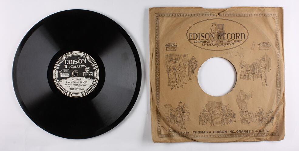 Side A: INDEX No. 24871 V/N/O 1 / EDISON RE-CREATION / A PRODUCT OF THE EDISON LABORATORIES / 82158-L / THE GYPSY TRAIL / (Ted B. Galloway, Op. 30, No. 2) / Baritone with Orchestra / ARTHUR MIDDLETON/ 5886 Side B: EDISON RE-CREATION / A PRODUCT OF THE EDISON LABORATORIES / 82158-R / LIFE'S DREAM IS O'ER / (Adapted to ""Alice Where Art Thou"") / Soprano and Contralto with Orchestra / MARIE RAPPOLD and CAROLINA LAZZARI / 6361 One side of sleeve: EDISON RECORD / (text and illustrations). Second side of sleeve: (text) / (Patents - list of years latest1918) / (text)
