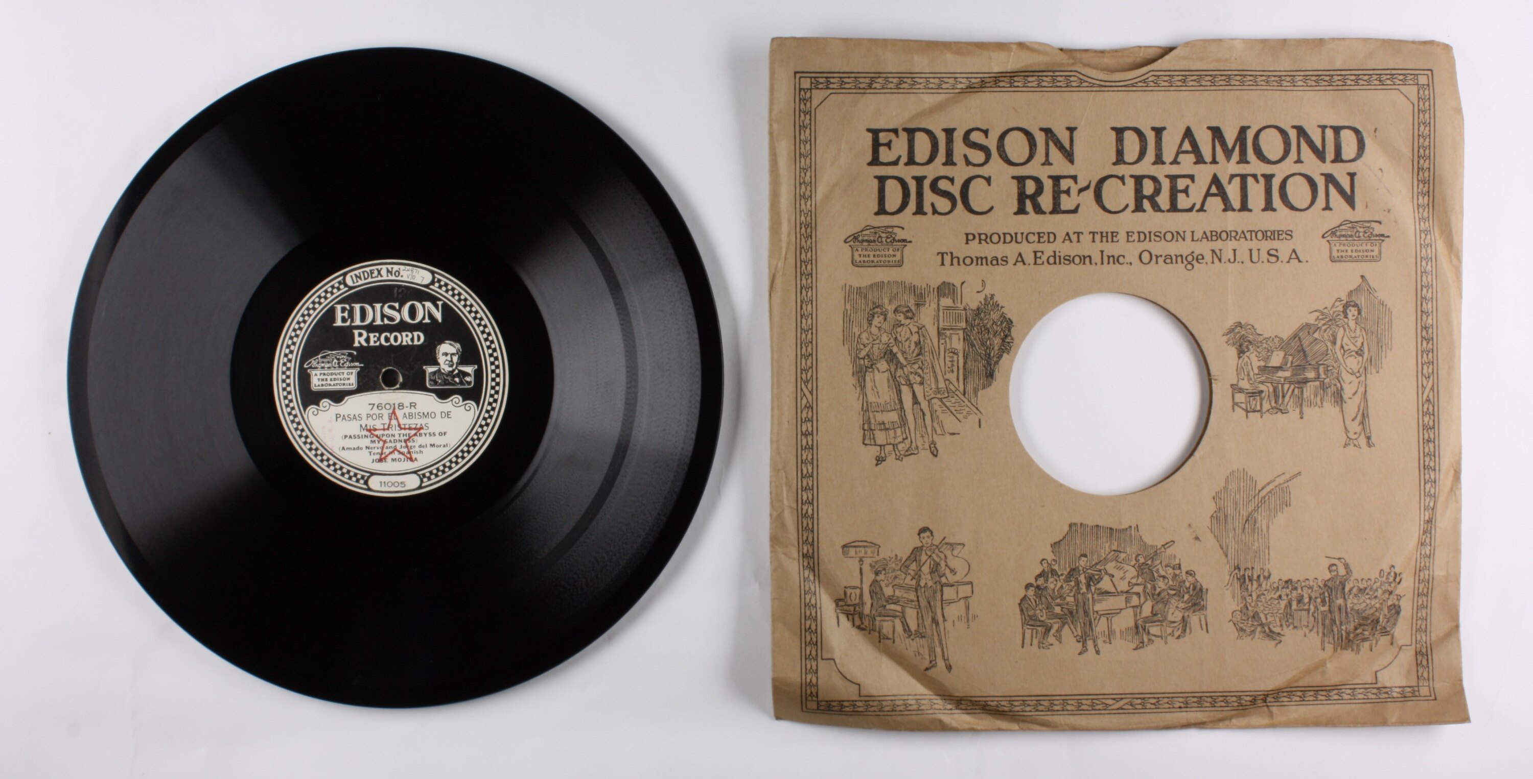 Side A: INDEX No. 24871 V/O 7 / EDISON RECORD / A PRODUCT OF THE EDISON LABORATORIES / 76018-R / PASAS POR EL ABISMO DE MIS TRISTEZAS / (PASSING UPON THE ABYSS OF MY SADNESS) / (Amado Nervo and Jorge del Moral) / Tenor in Spanish / JOSÉ MOJICA / 11005 Side B: EDISON RECORD / A PRODUCT OF THE EDISON LABORATORIES / 76018-L / GRATIA PLENA / (Amade Nervo and Mario Talavera) / Tenor in Spanish / JOSÉ MOJICA / Acompañamiento al piano / JOHN F. BURCKHARDT/ 10989 One side of sleeve: EDISON RECORD / (text and illustrations). Second side of sleeve: (text) / (Patents - list of years latest1918) / (text)