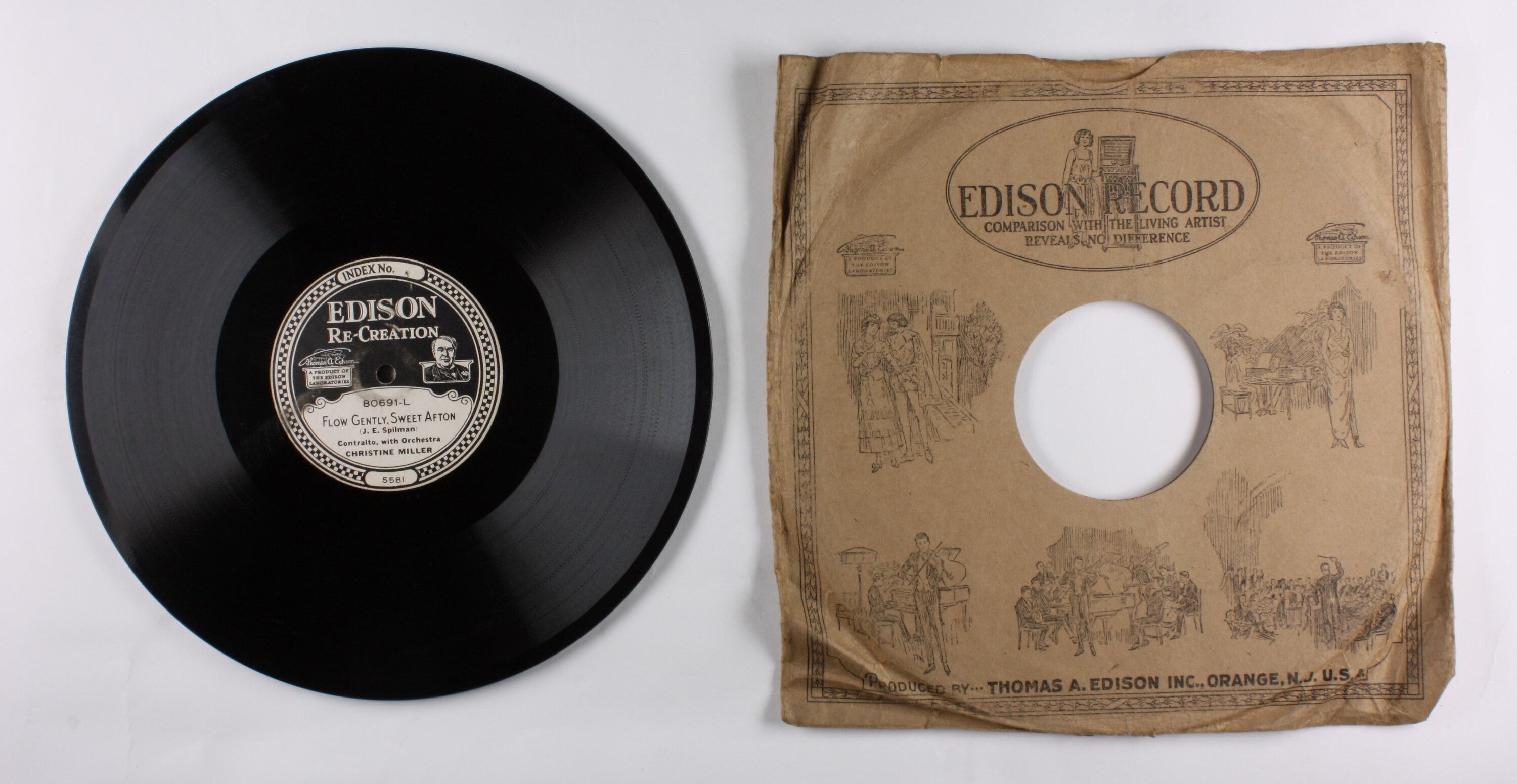 Side A: INDEX No. 24871 V/N/O 12 / EDISON RE-CREATION / A PRODUCT OF THE EDISON LABORATORIES / 80691-R / LOVE ME OR NOT / (Arr. by A. L. Secchi) / Tenor, with Orchestra / Paul Reimers / 7823 Side B: EDISON RE-CREATION / A PRODUCT OF THE EDISON LABORATORIES / 80691-L / FLOW GENTLY, SWEET AFTON / (J. E. Spilman) / Contralto, with Orchestra / CHRISTINE MILLER / 5581 One side of sleeve: EDISON RECORD / (text and illustrations). Second side of sleeve: (text) / (Patents - list of years latest1918) / (text)