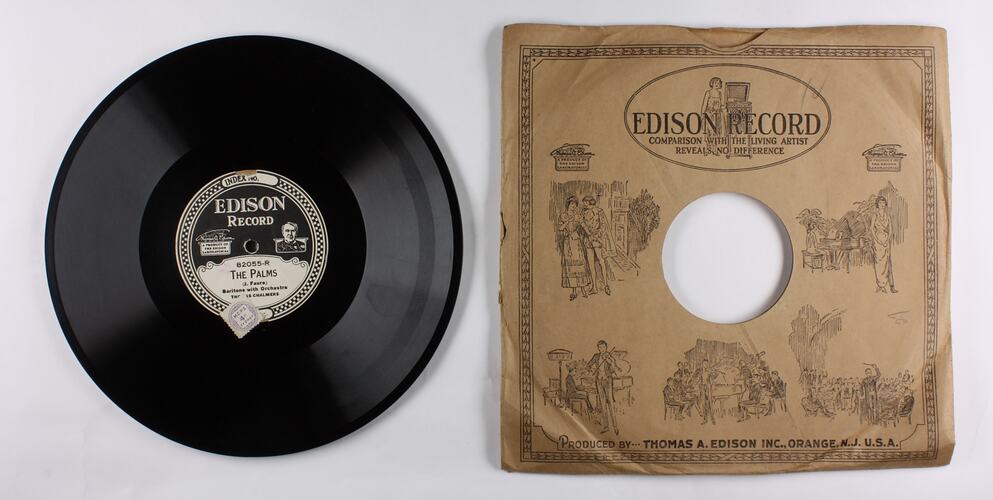 Side A: INDEX No. 24871 V/O 13 / EDISON RECORD / A PRODUCT OF THE EDISON LABORATORIES / 82055-L / O HOLY NIGHT / (Adolphe Adam) / Baritone and Chorus with Orchestra / Thomas Chalmers / 2693 Side B: EDISON RECORD / A PRODUCT OF THE EDISON LABORATORIES / 82055-R / THE PALMS / (J. Faure) / Baritone with Orchestra / THOMAS CHALMERS / (number obscured) One side of sleeve: EDISON RECORD / (text and illustrations). Second side of sleeve: (text) / (Patents - list of years latest1918) / (text)