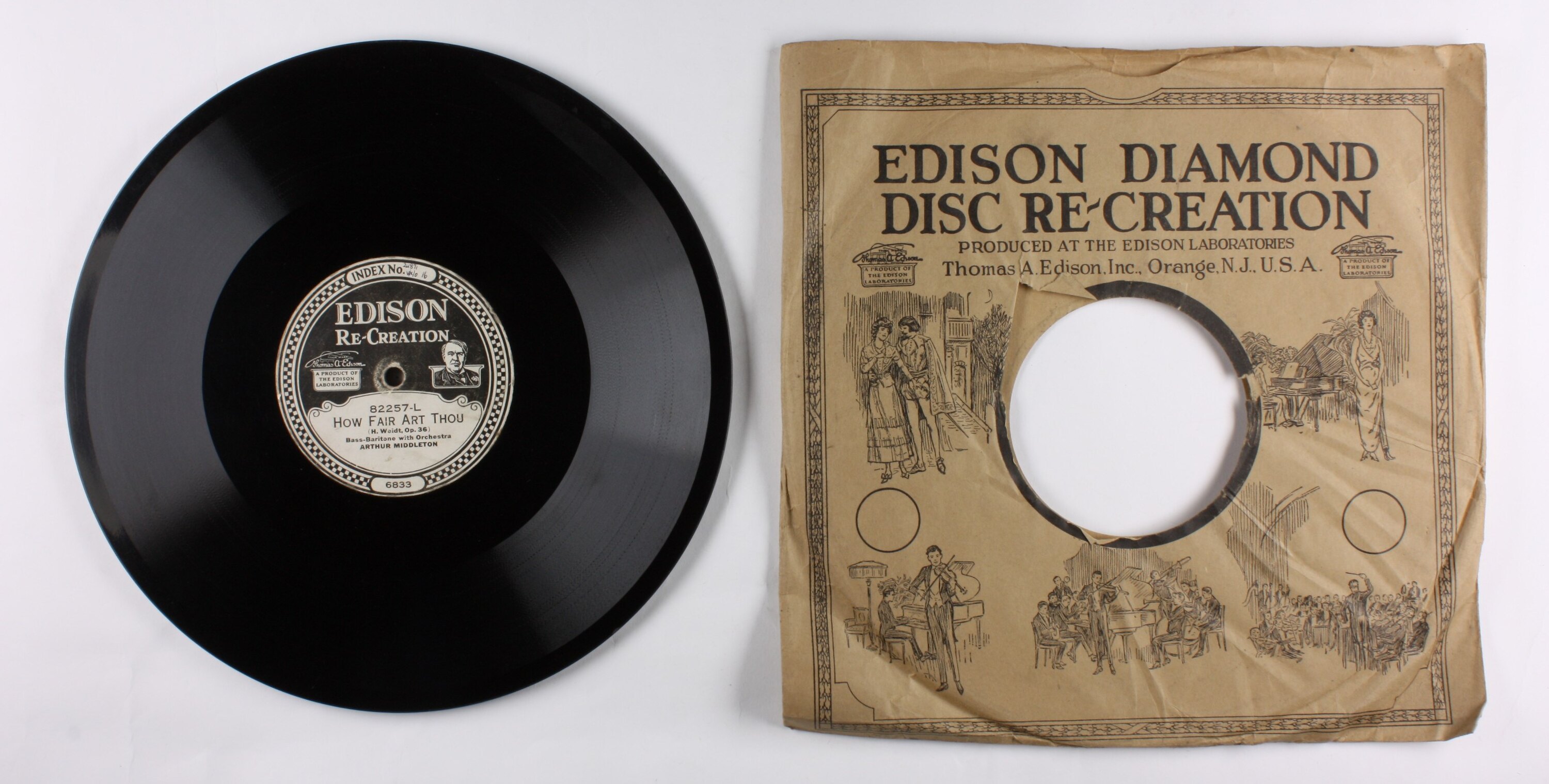 Side A: EDISON RE-CREATION / A PRODUCT OF THE EDISON LABORATORIES / 82257-L / HOW FAIR ART THOU / (H. Weidt, Op.36) / Bass-Baritone with Orchestra / ARTHUR MIDDLETON / 6833 Side B: EDISON RE-CREATION / A PRODUCT OF THE EDISON LABORATORIES / 82257-R / THE CHASE--HUNTING SONG / (Tito Mattei) / Bass-Baritone with Orchestra / ARTHUR MIDDLETON / 6840 Paper Sleeve Front side: EDISON DIAMOND / DISC RE-CREATION / <various drawings of small performances> Paper Sleeve back side: <listing of selected performances recently released>