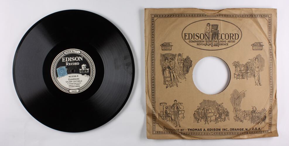 Side A: INDEX No. / EDISON RECORD / A PRODUCT OF THE EDISON LABORATORIES / 82339-L / SE TU M'AMI / (IF THOU LOV'ST ME) / (G. B. Pergolesi) / Soprano In Italian / CLAUDIA MUZIO / 9970 Side B: INDEX No. / EDISON RECORD / A PRODUCT OF THE EDISON LABORATORIES / 82339-R / GUARDAMI / VALZER CANTABILE / (A. Guagni-Benvenuti) / Soprano In Italian / CLAUDIA MUZIO / 9405 Paper Sleeve Front side: EDISON RECORD / COMPARISON WITH THE LIVING ARTIST REVEALS NO DIFFERENCE / <various drawings of small performances> Paper Sleeve back side: <listing of selected performances recently released>