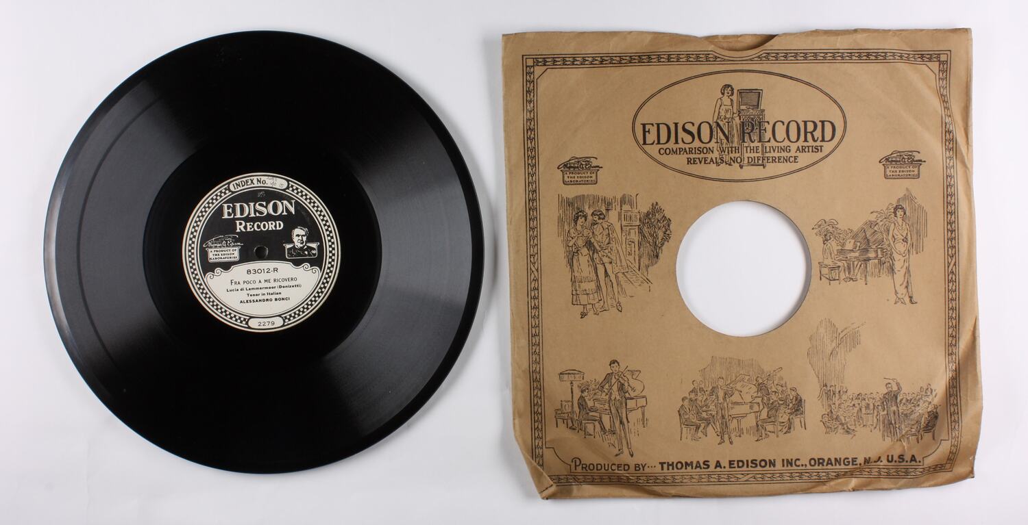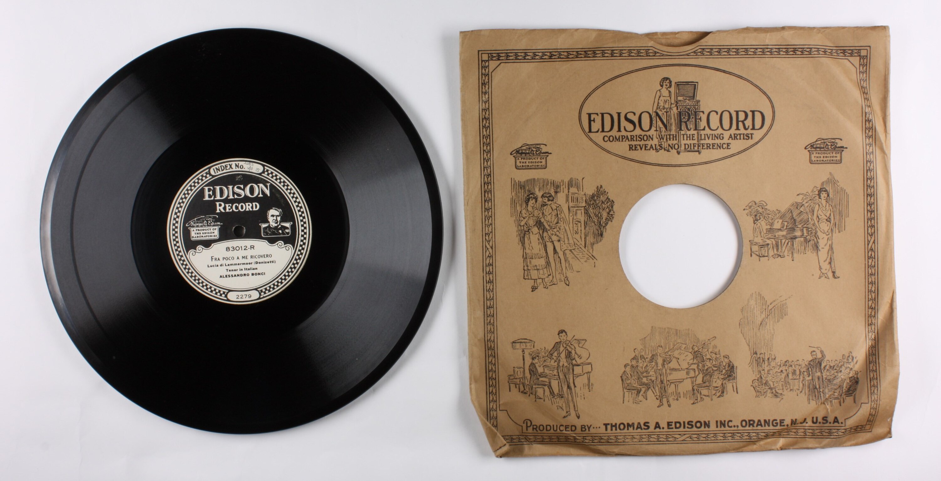 Side A: INDEX No. / EDISON RECORD / A PRODUCT OF THE EDISON LABORATORIES / 83012-L / EXPLANATORY TALK / BARRY E. HUMPHREY / 3337 Side B: INDEX No. / EDISON RECORD / A PRODUCT OF THE EDISON LABORATORIES / 83012-R / FRA POCO A ME RICOVERO / Lucia di Lammermoor (Donizetti) / Teno in Italian / ALESSANDRO BONCI Paper Sleeve Front side: EDISON RECORD / COMPARISON WITH THE LIVING ARTIST REVEALS NO DIFFERENCE / <various drawings of small performances> Paper Sleeve back side: <listing of selected performances recently released>