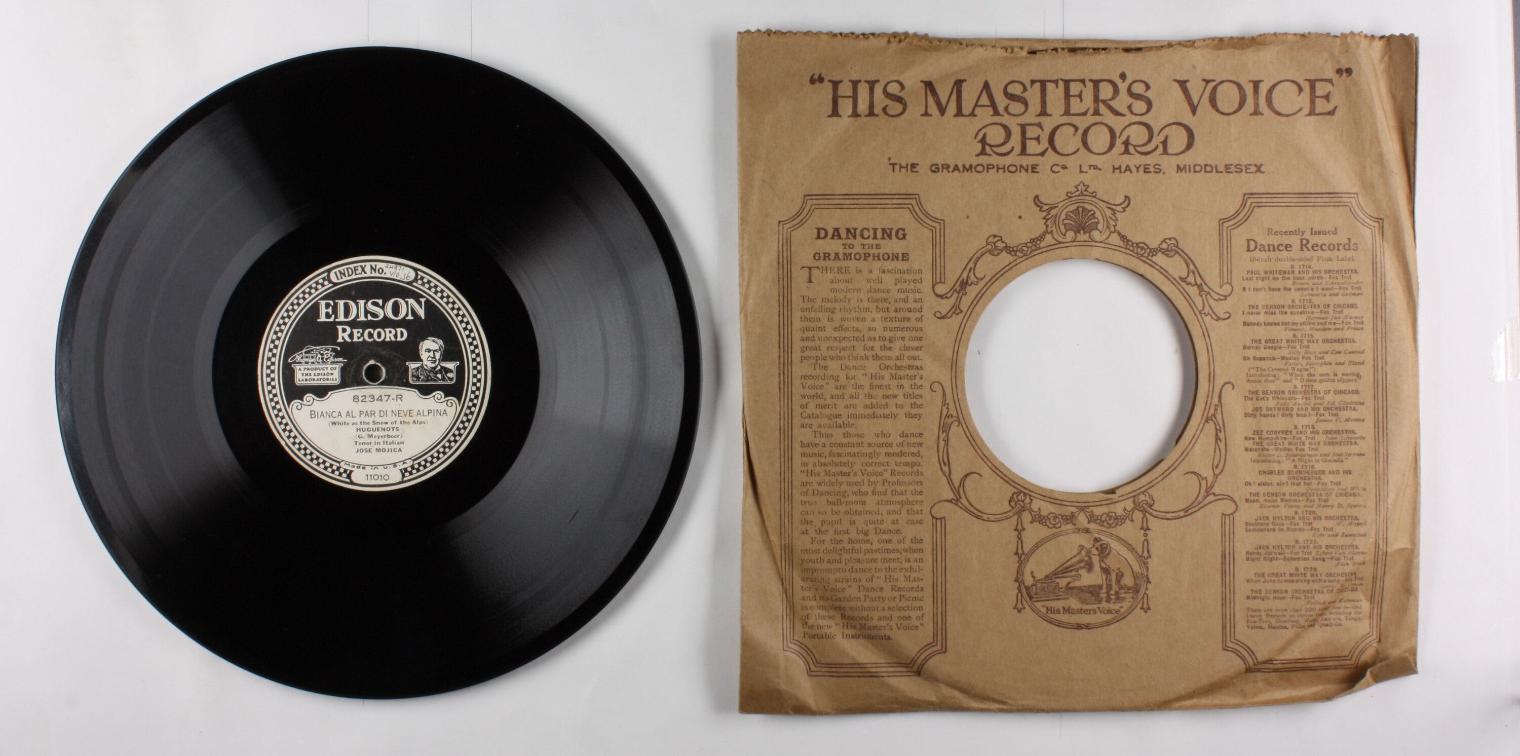 Side A: INDEX No. / EDISON / Record / A PRODUCT OF THE EDISON LABORATORIES / 82347-L / Fantaisie Aux Divins / Mensonges / (Wanton Fancy, So Divine) / LAKME (Leo Delibes) / Tenor in French / JOSE MOJICA / 11003 Side B: INDEX No. / EDISON / Record / A PRODUCT OF THE EDISON LABORATORIES / 82347-R / Bianca Al Par Di Neve Alpina / (White as the Snow of the Alps) / HUGUENOTS / (G. Meyerbeer) / Tenor in Italian / JOSE MOJICA Paper Sleeve, Side A: <not original> HIS MASTERS VOICE
