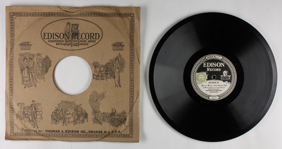 Side A: INDEX No. / EDISON RECORD / <copyright lable> / 80486-L / BALLET MUSIC FROM HENRY VIII / Shepherd's Dance \ (Edward German) / AMERICAN SYMPHONY / ORCHESTRA / 5928 Side B: INDEX No. / EDISON RECORD / <copyright lable> / 80486-L / BALLET MUSIC FROM HENRY VIII / (a) Morris Dance (b) Torch Dance \ (Edward German) / AMERICAN SYMPHONY / ORCHESTRA / 5927 Paper Sleeve, Side A: EDISON RECORD / COMPARISON WITH THE LIVING ARTIST / REVEALS NO DIFFERENCE