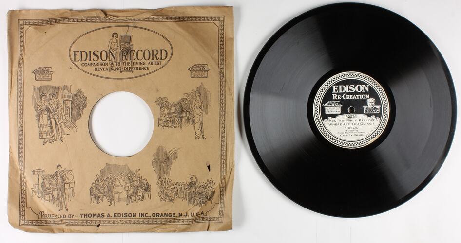 Side A: INDEX No. / EDISON / Re-Creation / A PRODUCT OF THE EDISON LABORATORIES / 82276 / You Horrible Fellow / Where Are You Going ? / Fidelio / (Beethoven) / Mezzo-Soprano in German / MARGARET MATZENAUER Side B: INDEX No. / EDISON / Re-Creation / A PRODUCT OF THE EDISON LABORATORIES / 82276 / Prize Song / Die Meistersinger / (Wagner) / Tenor in German / JACQUES URLUS Paper Sleeve, Side A: EDISON RECORD / COMPARISON WITH THE LIVING ARTIST / REVEALS NO DIFFERENCE Paper Sleeve, Side B: <Various titles listed>