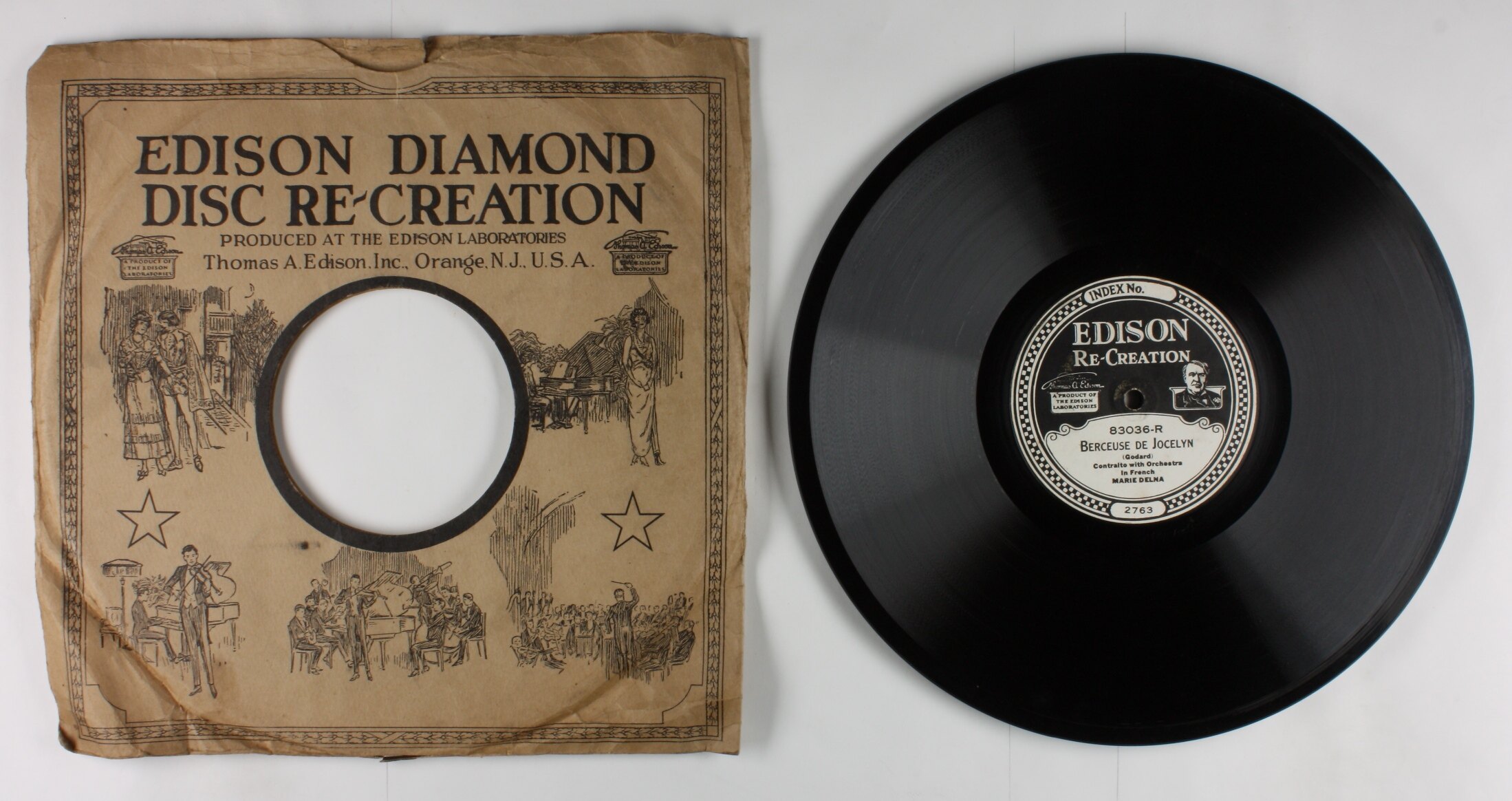 Side A: INDEX No. / EDISON / Re-Creation / A PRODUCT OF THE EDISON LABORATORIES / 83063-L / Explanatory Talk / HARRY E. HUMPHREY / 2999 Side B: INDEX No. / EDISON / Re-Creation / A PRODUCT OF THE EDISON LABORATORIES / 83036-R / Berceuse De Jocelyn / (Godard) / Contralto with Orchestra / in French / MARIE DELNA / 2763 Paper Sleeve Side A: EDISON DIAMOND / DISC RE-CREATION / <drawings of characters in opera performances> Paper Sleeve Side B: <listing of various perfomances availabe on Edison Records>