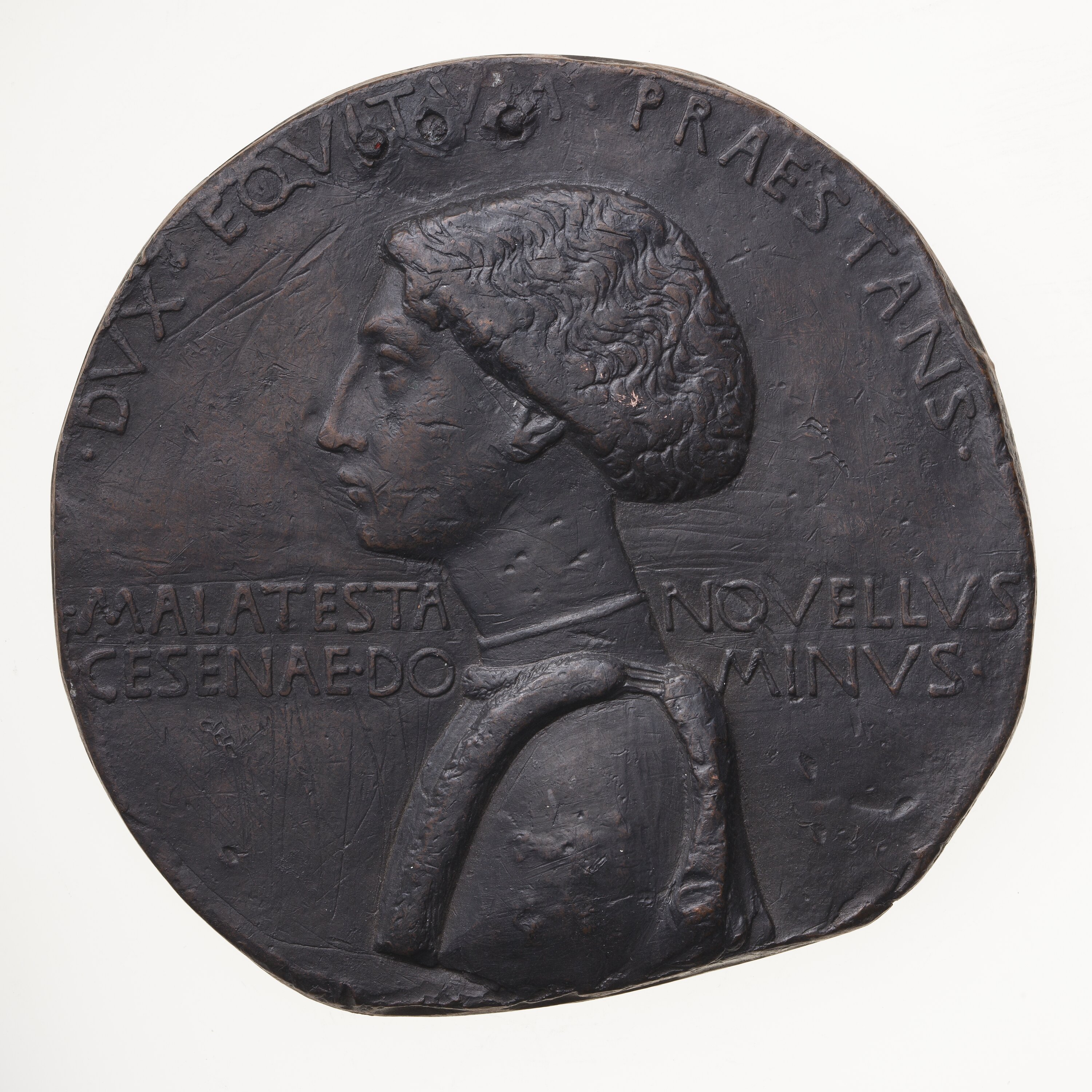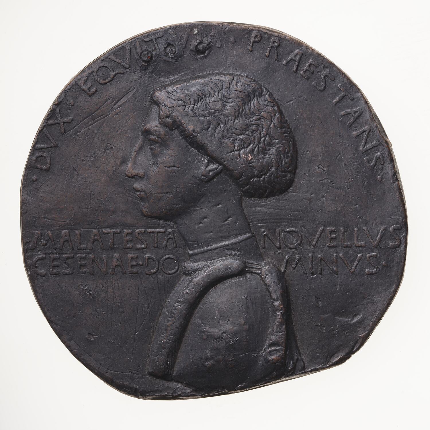 Bust of Domenico Novello Malatesta facing left, with short curly hair, wearing fur-trimmed coat without sleeves, across field in two lines divided by bust, MALATESTA NOVELLVS CESENAE DOMINVS (translation: Domenico Novello Malatesta Lord of Cesena); around above, DVX EQVITVM PRAESTANS
