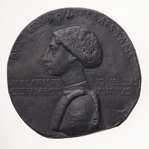 Copy in two halves of a medal of Domenico Malatesta also known as Novello. The original medal was made in about 1450 by Pisanello. This Electrotype copy made circa 1881 by Robert Ready.The original medal, acquired by the British Museum in 1875 (Reg. 1875, 1004.4) , was exhibited in the King's Library in 1881 and is No. 5 in the catalogue of that exhibition. It is thought that this electrotype was produced in association with that exhibition and publication and acquired by the National Gallery of Victoria where it was displayed in the late 1880s.