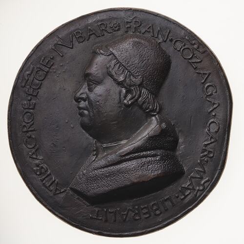 Bust of Francesco facing left in cardinal's cape and cap; around, FRAN . GOZAGA . CAR . MAT . LIBERALITATIS . AC . ROE . ECCIE . IVBAR .