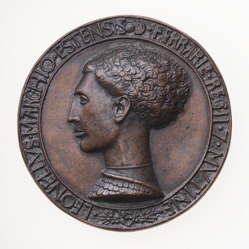 Copy in two halves of a medal of Leonello d'Este. The original medal was made circa 1441 to 1444 by Antonio Pisano (Pisanello). This Electrotype copy made circa 1881 by Robert Ready. The original medal was acquired by the British Museum and later exhibited in the King's Library in 1881. It is No. 44 in the catalogue of that exhibition. It is thought that this electrotype was produced in association with that exhibition and publication and acquired by the National Gallery of Victoria where it was displayed in the mid 1880s.