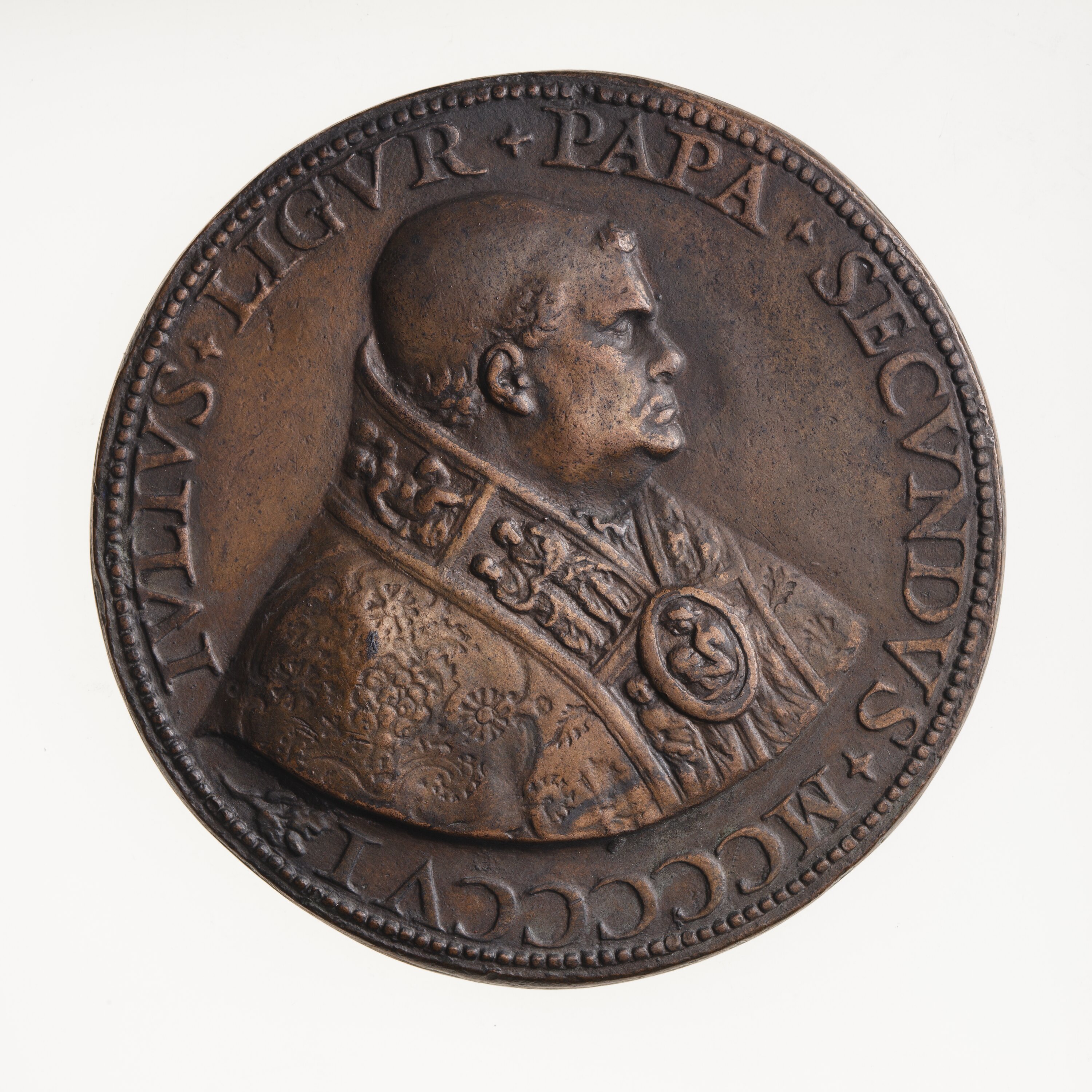 Bust of Julius II facing right, tonsured, wearing cape with incised ornament and panelled orphrey; around, IVLIVS . LIGVR . PAPA . SECVNDVS . MCCCCCVI