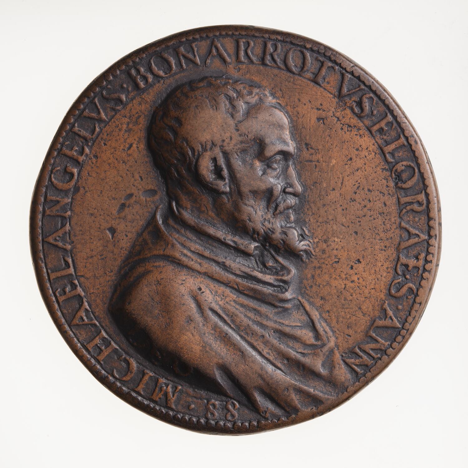 Bust of Michelangelo Buonarroti facing right, bearded, wearing a hooded cassock; around, MICHAELANGELVS . BONARROTVS . FLOR . AET.S .ANN 88 .; on neck truncation the artist's signature, LEO