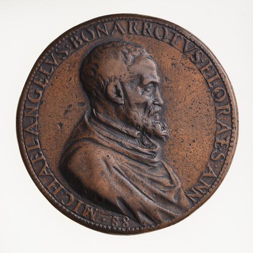 Copy of a medal of Michelangelo Buonarroti. The original medal, by Lione Lioni, was made in about 1564. This Electrotype copy made circa 1881 by Robert Ready. The original medal from the collection of George III (Reg: G3,IP.119) was exhibited in the King's Library of the British Museum in 1881 and is No. 98 in the catalogue of that exhibition. It is thought that this electrotype was produced in association with that exhibition and publication and acquired by the National Gallery of Victoria where it was displayed in the late 1880s. The original medal is cast bronze, this electrotype is copper plated and toned.