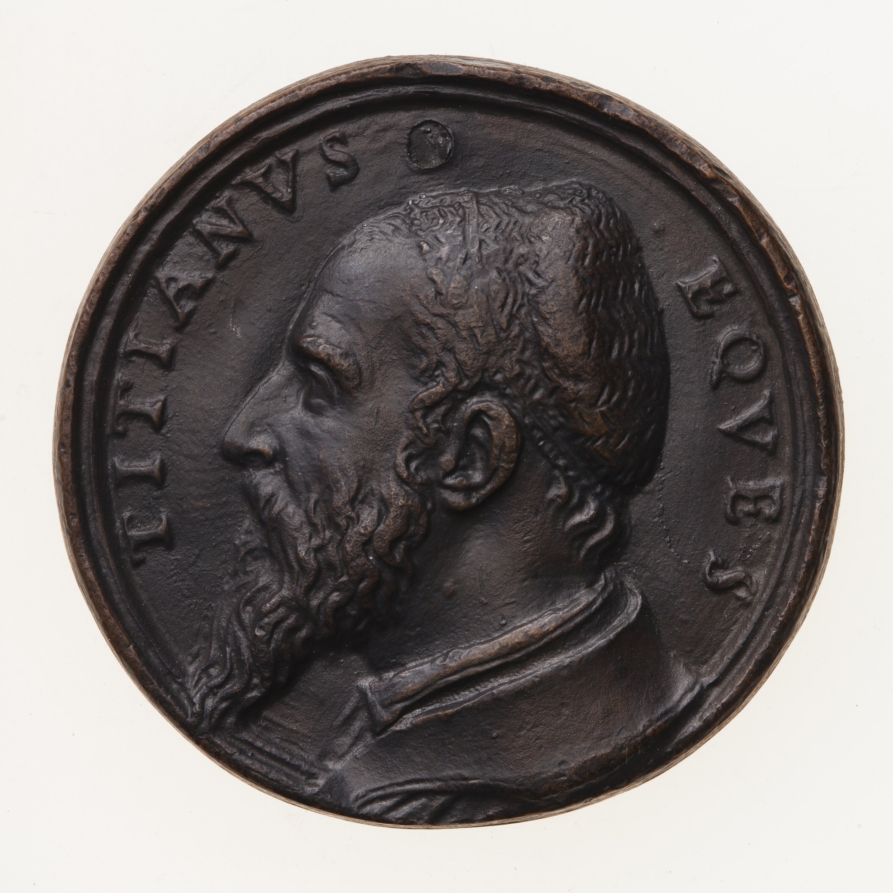 Bust of Titian facing left wearing a tunic and cloak, close-fitting cap or hairnet on back of his head; around, TITIANVS EQVES