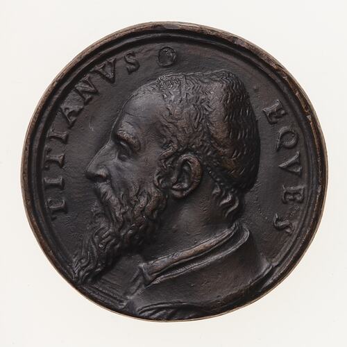 Copy of a medal of Tiziano Vecelli (Titian). The original medal, by Pastorino de' Pasterini, was made in about 1545. This Electrotype copy made circa 1881 by Robert Ready. The original cast lead medal was acquired by the British Museum in the collection of King George III (Reg: G3,IP.1070). It was exhibited in the King's Gallery in 1881 and is No. 146 in the catalogue of that exhibition. It is thought that this electrotype was produced in association with that exhibition and publication and acquired by the National Gallery of Victoria where it was displayed probably from the late 1880s.The electrotype is copper plated and toned.
