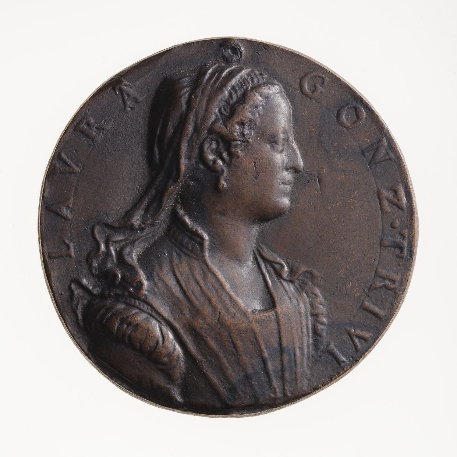 Bust of Laura Gonzaga Trivulzio facing right, wearing a collared gown, an ear-ring and a (widow's?) veil which falls onto her shoulders; around, LAVRA GONZ . TRIVL