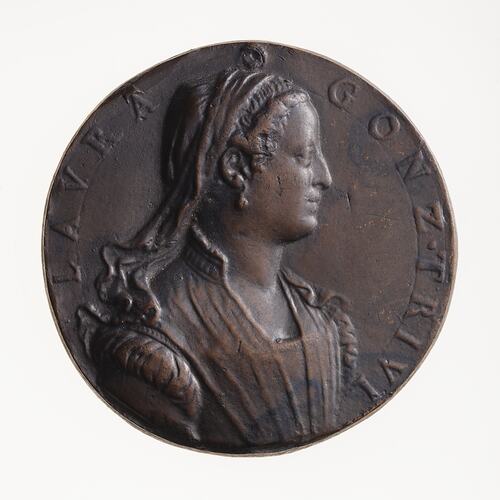 Copy of a medal of Laura Gonzaga Trivulzio. The original medal, by an unknown artist, was made in about 1550. This Electrotype copy made circa 1881 by Robert Ready. The original medal from the collection of George III (Reg: G3,MantM.13) was exhibited in the King's Library of the British Museum in 1881 and is No. 260 in the catalogue of that exhibition. It is thought that this electrotype was produced in association with that exhibition and publication and acquired by the National Gallery of Victoria where it was displayed in the late 1880s. The original medal is cast lead, this electrotype is copper plated and toned.