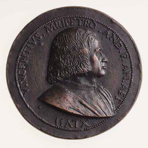 Copy of a medal of Vincenzo di Andrea Malipieri. The original medal, by Maffeo Olivieri, was made in 1523. This Electrotype copy made circa 1881 by Robert Ready. The original medal was exhibited in the King's Library of the British Museum in 1881 and is No. 274 in the catalogue of that exhibition. It is thought that this electrotype was produced in association with that exhibition and publication and acquired by the National Gallery of Victoria where it was displayed in the late 1880s. The original medal is cast bronze the electrotype copper plated and toned.