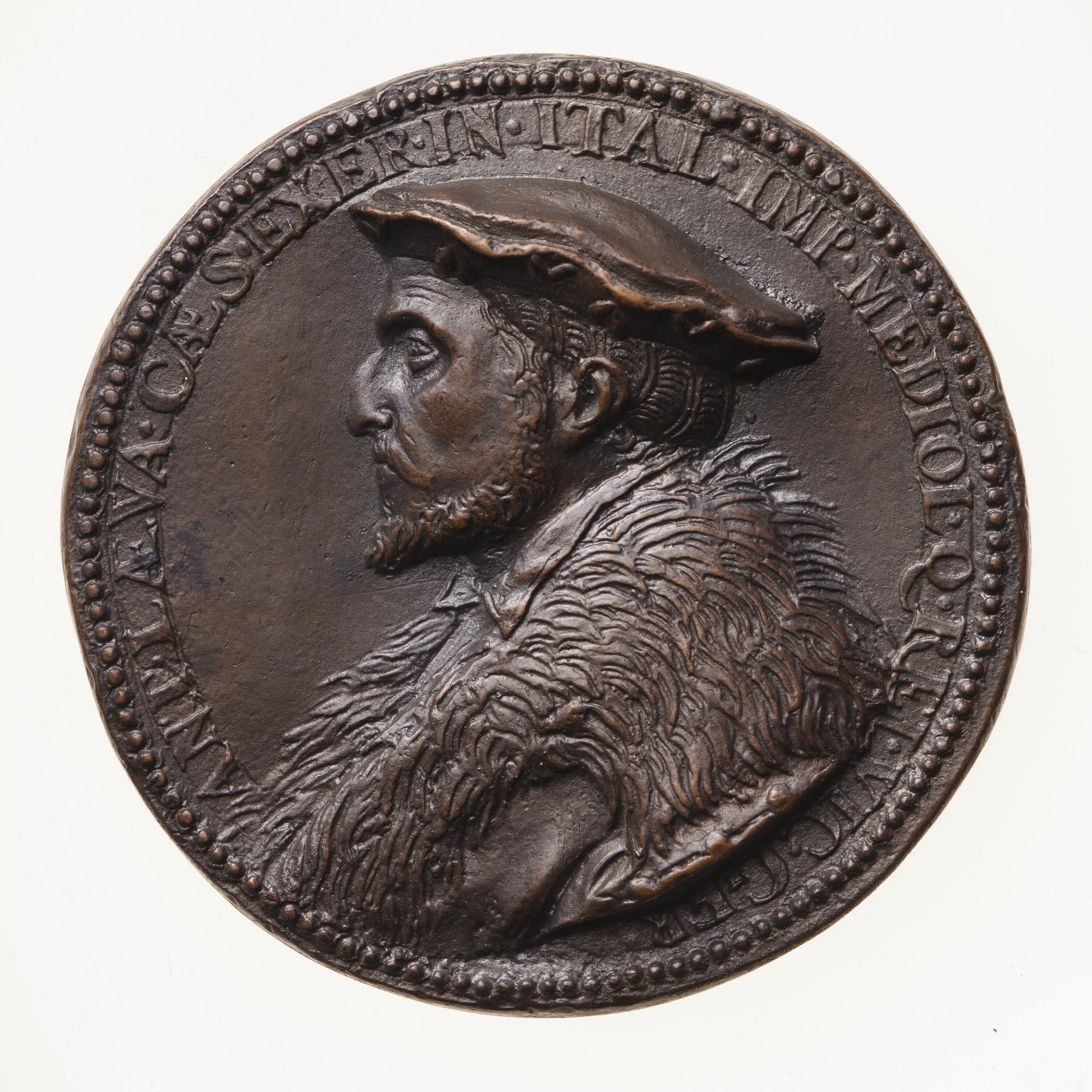 Bust of Antonio facing left in furred cloak, and cap of German style; around, ANT . LAEVA . CAES . EXER . IN . ITAL . IMP . MEDIOL . Q . REI . VIC . GER .