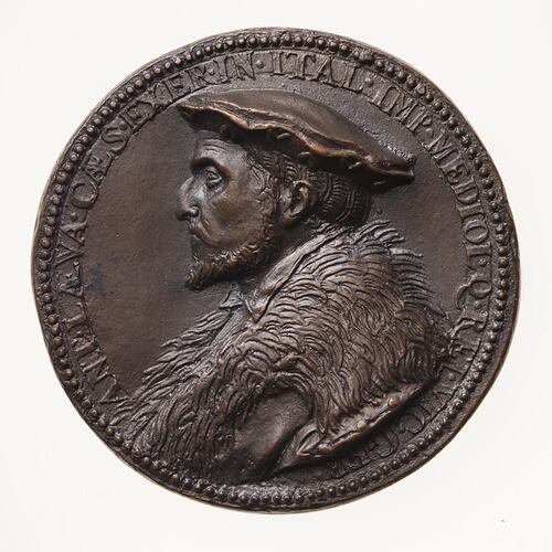 Copy of a medal of Antonio de Leyva. The original medal, by an unknown artist, was made in about 1530. This Electrotype copy made circa 1881 by Robert Ready. The original medal from the collection of George III (British Museum Reg: G3,IP.559) was exhibited in the King's Library of the British Museum in 1881 and is No. 283 in the catalogue of that exhibition. It is thought that this electrotype was produced in association with that exhibition and publication and acquired by the National Gallery of Victoria where it was displayed in the late 1880s. The original medal is cast bronze the electrotype copper plated and toned.