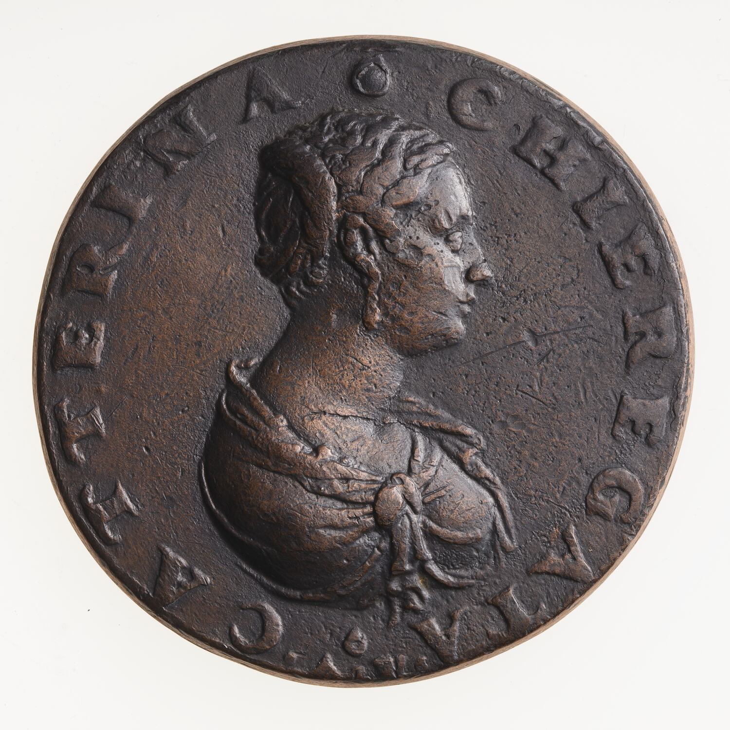 Bust of Caterina Chiericata facing right, wearing loose dress and ear-ring, hair braided; around, CATTERINA . CHIEREGATA .; below bust, AGV