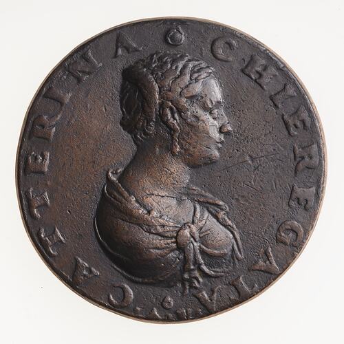 Copy of a medal of Caterina Chieregato. The original medal, by Alessandro Vittoria, was made in about 1552. This Electrotype copy made circa 1881 by Robert Ready. The original medal from the collection of George III (British Museum Reg: G3,IP.269) was exhibited in the King's Library of the British Museum in 1881 and is No. 297 in the catalogue of that exhibition. It is thought that this electrotype was produced in association with that exhibition and publication and acquired by the National Gallery of Victoria where it was displayed in the late 1880s. The original medal is cast lead the electrotype copper plated and toned.