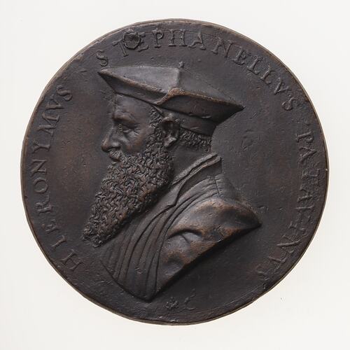 Copy of a medal of Girolamo Stefanelli. The original medal, by an unknown artist, was made in the 16th Century. This Electrotype copy made circa 1881. British Museum electrotype made by Robert Ready. The original medal was exhibited in the King's Library of the British Museum in 1881 and is No. 299 in the catalogue of that exhibition. It is thought that this electrotype was produced in association with that exhibition and publication and acquired by the National Gallery of Victoria where it was displayed in the late 1880s. The original medal is cast lead the electrotype copper plated and toned.