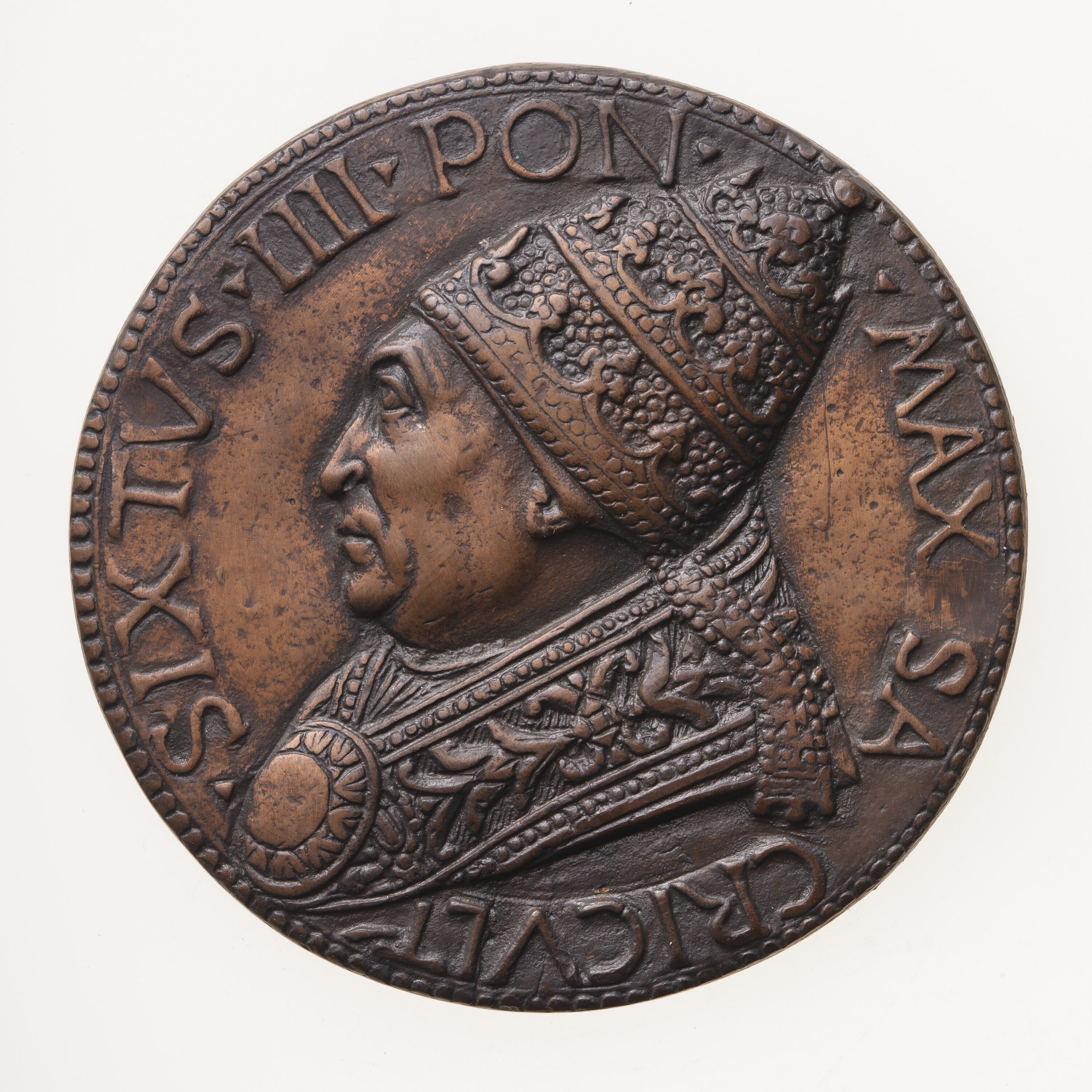 Bust of Sixtus IV facing left in Papal robes and tiara; around, . SIXTVS . IIII . PON . . MAX SACRICVLT